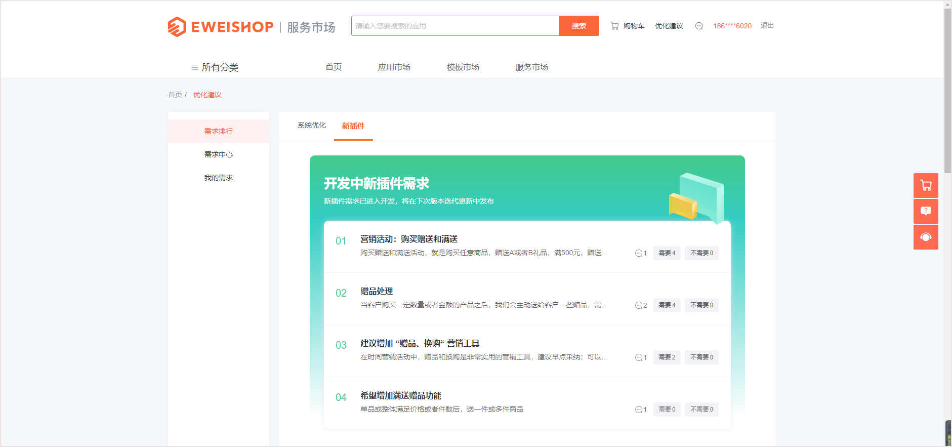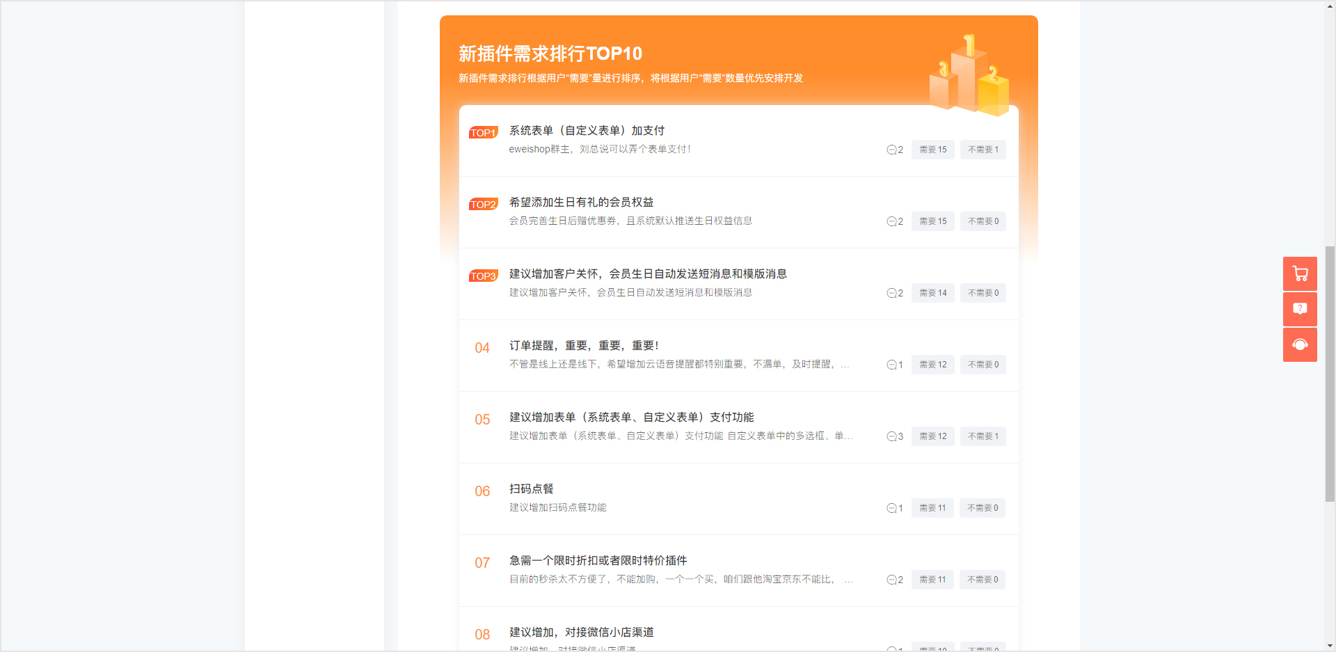 被点击“需要”的需求越多排名越靠前,我们将会根据需求排行榜中的排名顺序进行后续需求和插件的开发。