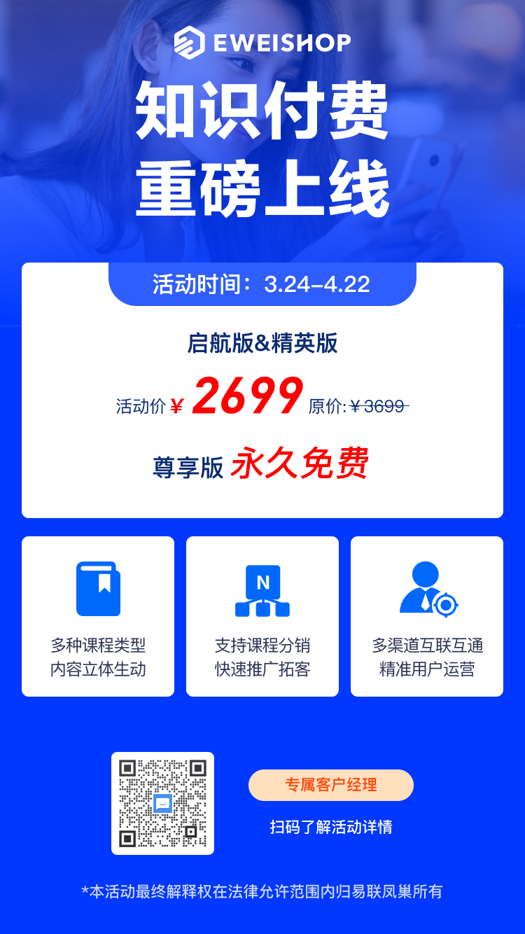 通过EWEISHOP,老板们不仅可以在垂直领域轻松进行知识变现,更能全面打通线上线下,构建并运营私域流量池,为用户提供更加完善的知识服务,逐步实现标准化和规模化的知识付费商业模式。