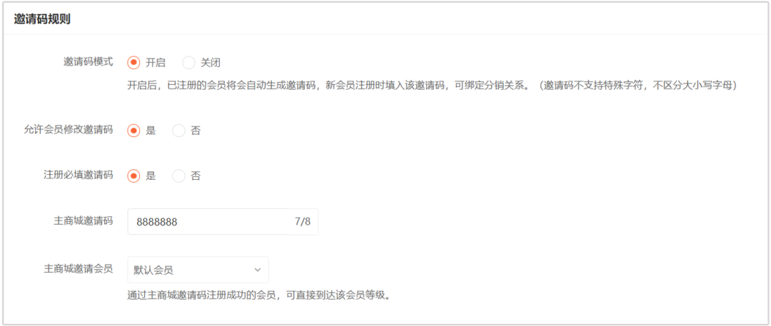 开启邀请码模式后,已注册的会员将自动生成邀请码,可选择注册必填邀请码,构建熟人电商社区,同时邀请码可绑定分销关系。