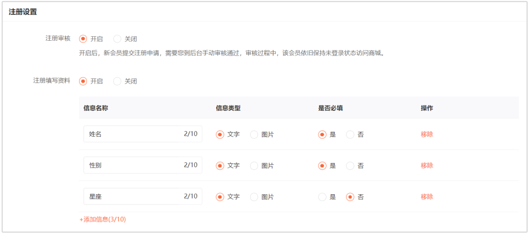 可灵活设置注册会员时需填写的资料项,支持上传文字或图片。
