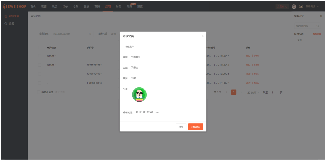 新会员提交申请后,商家需要到后台进行手动审核通过。