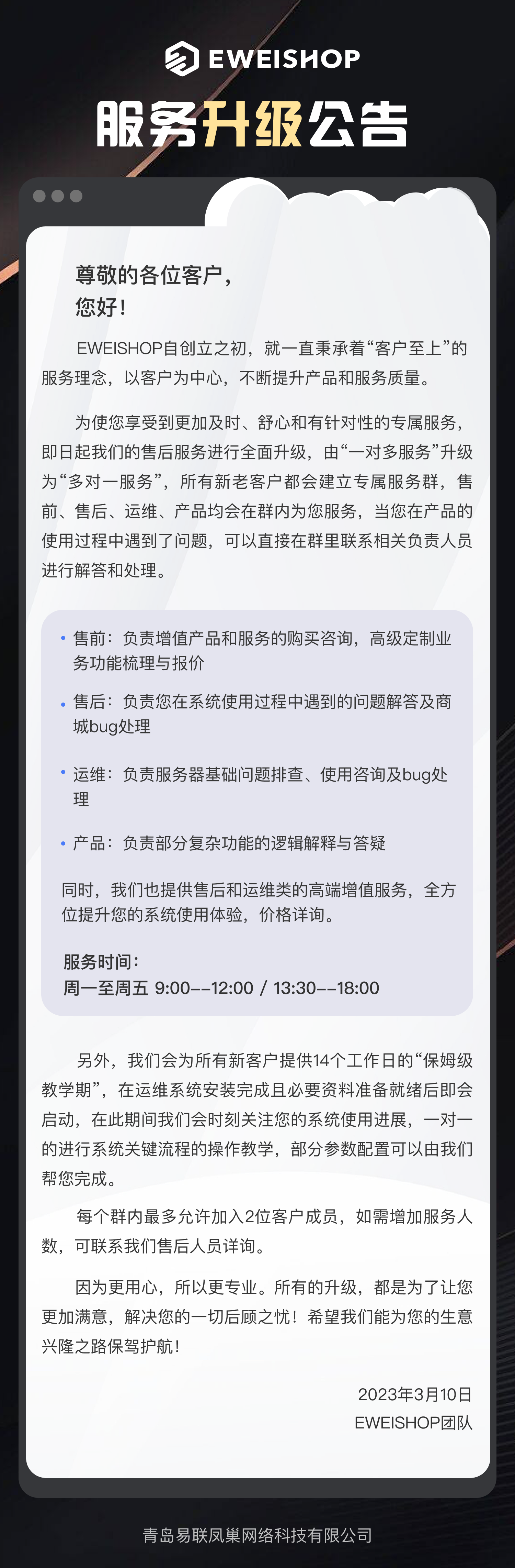 EWEISHOP客户服务全面升级,特此公告。
