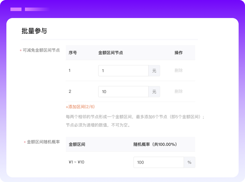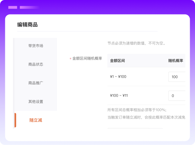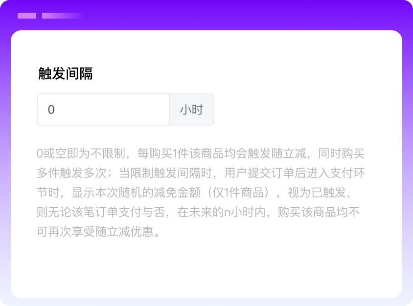 2.当设置触发间隔后,在未来的n小时内购买该商品均不可再次享受随立减优惠,避免用户多次下单不付款,恶意刷取高额立减金。