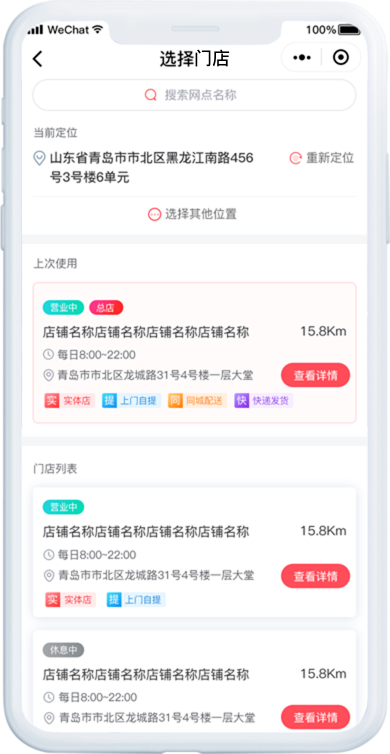 买家:根据所在位置推荐附近门店,门店列表自由切换